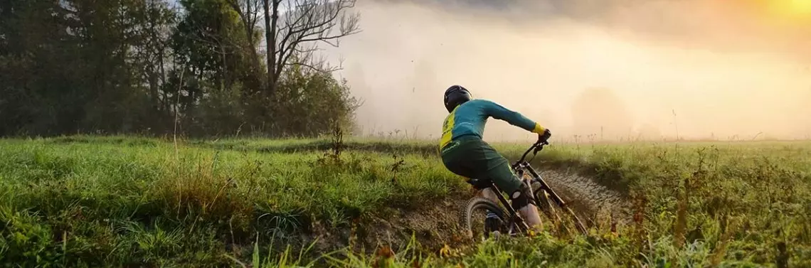W dolinie panowała całkowita cisza i nagle podbiegły do nas dwa retrievery. Jeden jasny, a drugiego ledwie co było widać, bo był czarny jak smoła. Machały przyjaźnie ogonami, po czym biały gdzieś się zawieruszył, ale czarny ustawił się na pozycji lidera i pociągnął nas za sobą. Wiedział nawet, gdzie skręcić, i nie odpuszczał na czele. Szczęk przerzutek, przypominający przeładowywany karabin, niósł się w śpiącej okolicy. Silnik cicho mruczał, a my oddalaliśmy się od cywilizacji. Kiedy wyjechaliśmy na szczyt wzniesienia, zrobiło się różowo. „Nasz” pies był cały mokry od rosy i otrzepywał ją na na nas, ilekroć dobiegł bliżej. Próbowaliśmy go skłonić do odwrotu, ale bezbłędnie wskazał nam kierunek do ścieżki podjazdowej. Mamy w repertuarze takie wycieczki, w których jakiś pies dołącza, ale tym razem stanowczo zabroniłem głaskać i dokarmiać, licząc na to że się odczepi. Czarny wyglądał na pełnoletniego i dobrze mu z oczu patrzyło, dlatego zaakceptowałem jego towarzystwo. Sztuczne ścieżki ośrodka Kycerka zlokalizowane w Velkych Karlovicach zostawiliśmy na kiedy indziej i ruszyliśmy dalej w stronę grzbietu, żeby polną graniówką, która w aplikacji