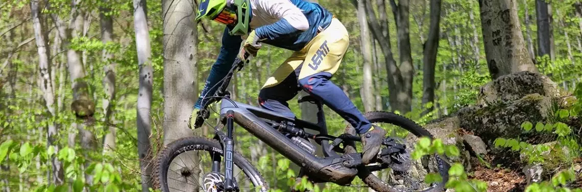 Gwiazdą programu w przypadku tego modelu jest nowy silnik Shimano EP8, który względem poprzednika (STEPS E8000) wyróżnia się większym momentem obrotowym (85 Nm) oraz mniejszymi rozmiarami i masą. Silnik pracuje bardzo płynnie, choć sprawia wrażenie, jakby miał mniej siły niż konkurencja. Przy mocnym naciśnięciu na pedały rower, zamiast wyskakiwać jak z procy, delikatnie dawkuje moment obrotowy, dbając o efektywność napędzania. Takie zachowanie jest całkiem przyjemne podczas wychodzenia z ciasnych zakrętów, kiedy pół obrotu korbą napędza z gracją i napełnia poczuciem kontroli nad przyczepnością. Dla tych, którym przeszkadza zerojedynkowość działania Boscha, EP8 będzie ideałem. Komputer systemu wspomagania można połączyć za pomocą Bluetooth ze swoim telefonem i dostosować takie parametry pracy silnika, jak moment obrotowy czy charakter wspomagania dla każdego trybu. Canyon wyposażył swojego najbardziej zwariowanego elektryka w baterię o relatywnie niedużej pojemności 500 Wh, co miało genezę w chęci zachowania jak najniższej masy i lepszym położeniu środka ciężkości. Założenie jest takie, że Torque:ON ma być używany w środowiskach bikeparkowych, gdzie co okrążenie mamy dostęp do np. samochodu, z którego możemy wyjąć zapasową baterię. W trybie Boost udawało się pokonać średnio 600 m w pionie na jednym ładowaniu, co jest wynikiem bardzo zadowalającym. Pozycja do podjazdów jest wygodna aż do przesady, ale bez wspomagania jazda Canyonem to męczarnia. Problemem jest sztyca o bardzo krótkim skoku i bardzo „kanapowate” zawieszenie obsługiwane przez damper bez blokady. Przy jeździe z włączonym silnikiem Torque:ON jest całkiem efektywny, potrzeba pokaźnej ściany, żeby zerwać przyczepność tylnego lub przedniego koła.