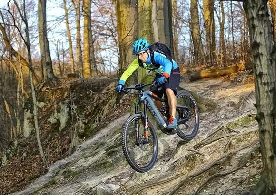 Po asfaltowej drodze jedzie się bardzo przyjemnie, choć przy mocniejszym pedałowaniu pod górę czuć lekkie kołysanie zawieszenia. Nie jest to jednak rower do bujania się wzdłuż rzecznych bulwarów, dlatego możliwie szybko skracam dojazdówkę do terenowej pętli testowej. Połykam pierwsze metry szutrówki i wjeżdżam do pagórkowatego lasu. Elektryki to najlepsze rowery do jazdy w takim terenie. Szybkie zmiany podjazdów w zjazdy na rowerze bez prądu męczą ekspresowo. E-bike’iem można śmigać długo i z pełną frajdą. Wspomaganie w Cube zapewnia silnik Bosch CX z momentem 75 Nm, dającym sobie radę znakomicie również na stromszych podjazdach. Trzeba tylko maksymalnie zredukować biegi i nie porywać się na zbyt luźne podłoże, na którym opony już sobie nie radzą. Napęd ma bardzo dobrze zrównoważoną czułość. Nie zwleka z dodawaniem mocy, co przydaje się przy ruszaniu na podjazdach. Nie jest zbyt czuły, co w niektórych napędach objawia się nerwowym drżeniem korby, jak arab rwący się do galopu. Do wspomagania używałem przeważnie trybów Tour i MTB. Najsłabszy Eco nie daje frajdy w terenie, a Turbo dodaje kopa, ale szybko drenuje baterie. Zawsze najlepiej zacząć jazdę od trybów z najmniejszą mocą. Najdłużej pojeździmy, trochę się pomęczymy dla zdrowia, a schodzenie z wyższych trybów wspomagania na niższe jest dołujące. Ma się wtedy to dziwne wrażenie, że nam też ktoś odłącza baterię.