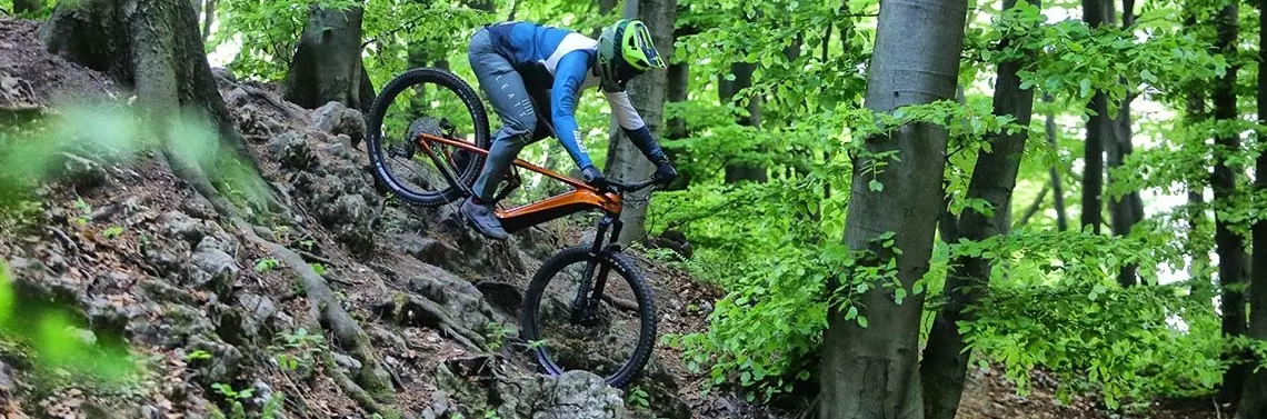 Choć Reign E+ to rower do ciężkiego enduro, jego zdolności podjazdowe są zaskakujące. Przede wszystkim należy zaznaczyć, że pozycja za kierownicą jest niezwykle wygodna, głównie za sprawą wręcz karykaturalnie stromej podsiodłówki. Płynne dawkowanie mocy przez silnik oraz dość czułe tylne zawieszenie tworzą warunki do bardzo efektywnego podjeżdżania, nawet gdy do gry wchodzą korzenie podbijające koła w powietrze. Można śmiało przenosić ciężar ciała na kierownicę bez obawy o zabuksowanie kołem.